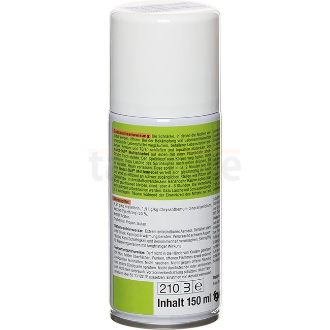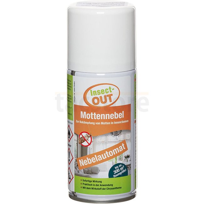 Insect-OUT Anti-Moth Mist 150 ml - Aerosol mist against moths for rooms up to 300 m¸. Contains Prallethrin, Pyrethrum extract, Acetone. Propane & Butane propellant.