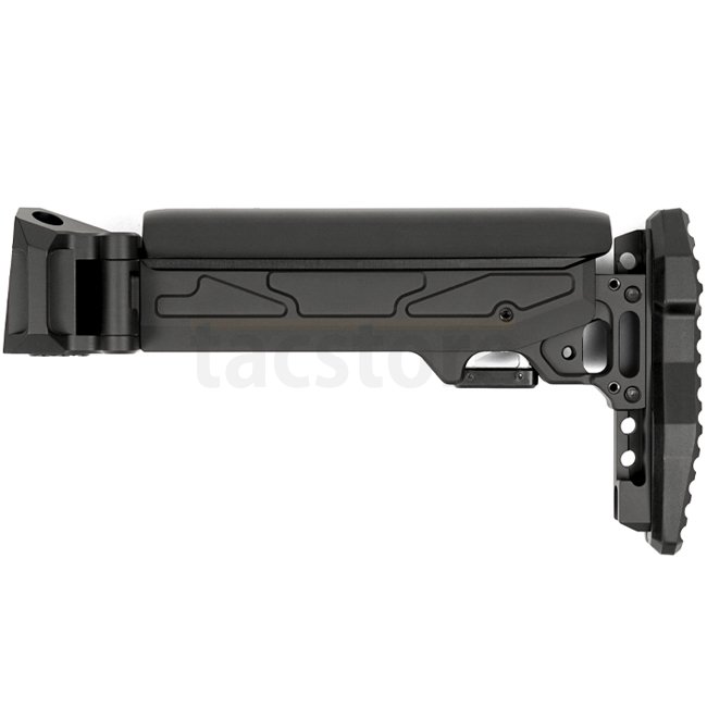 Adjustable folding stock for AKS platforms. Left-side fold with precision fit. Telescopic design with 4.5mm hinge. Weight: 525g. Adjustable length from 20cm to 27cm. Offers 4 cheek riser positions and ±3cm buttplate adjustment. Constructed with 7075 alumi