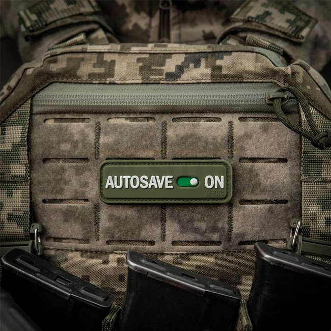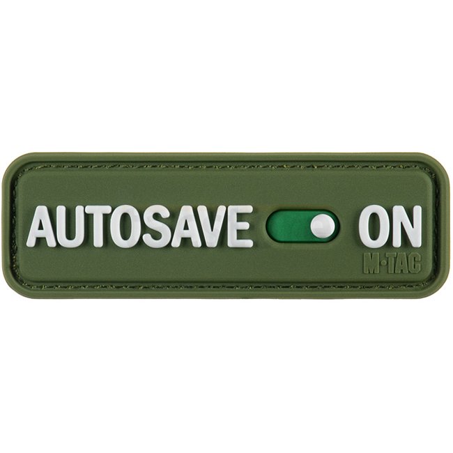 M-Tac Autosave Rubber Patch - Olive. PVC front, Hook back, 80x25 mm dimensions.