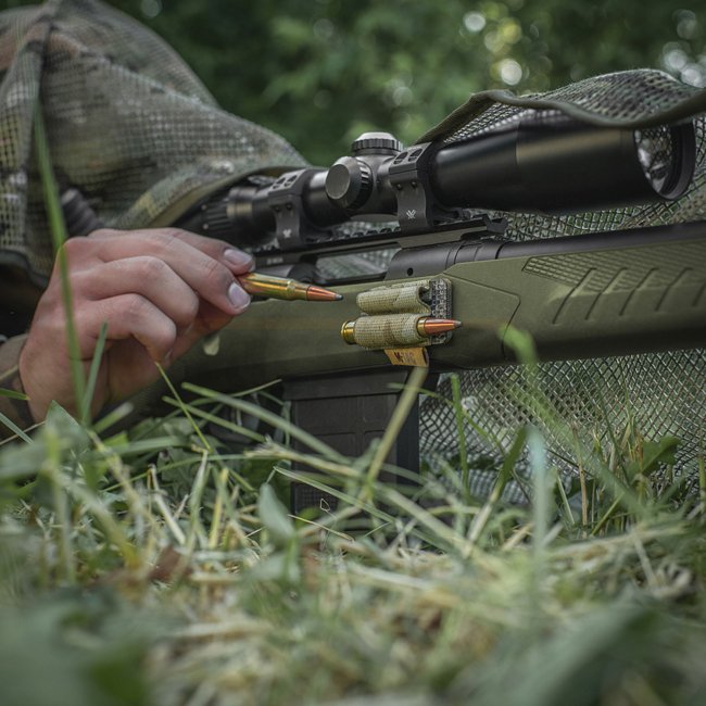 The design of the product is a carbon platform with elastic webbing that reliably fix two .338 caliber shells (8,6×70 mm). The Velcro panel is attached to the stock or receiver using a 3M polymer adhesive base. This shell holder is attached with a Velcro panel to the weapon, which can be removed if necessary without disconnecting the Velcro base from the rifle. |