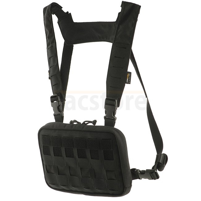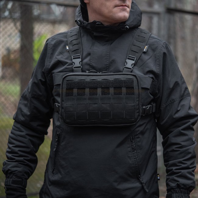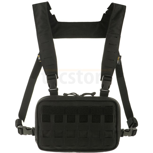 The M-Tac Chest Rig Elite in Black offers comfort, versatility, and functionality in one. Equipped with a MOLLE Laser Cut front panel, fastex quick dump system, and modular inserts for customization. Made of Cordura 500, lightweight at 425g, and with dime