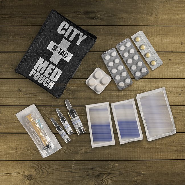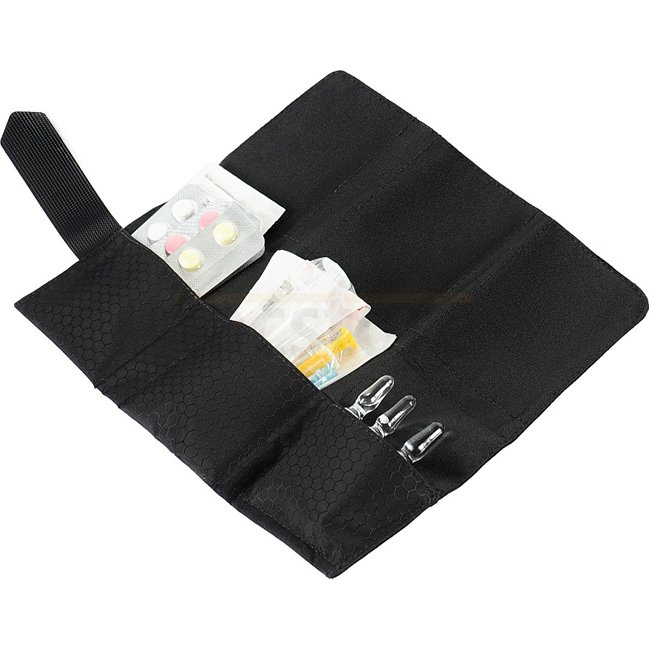 Made of Hex Polyester, a quality, durable and easy-care material. Closes with Velcro. It has three compartments for transporting an individual set of first aid prodcuts: tablets, plasters, hemostatic agents, a small number of antiseptic dressings, etc. Also, the designers have provided rubber bands for ampoules with a volume of 2ml and 5ml in one compartment. The displayed content is not incuded, the pouch is delivered empty and needs to be configured to the specific needs of the user.
