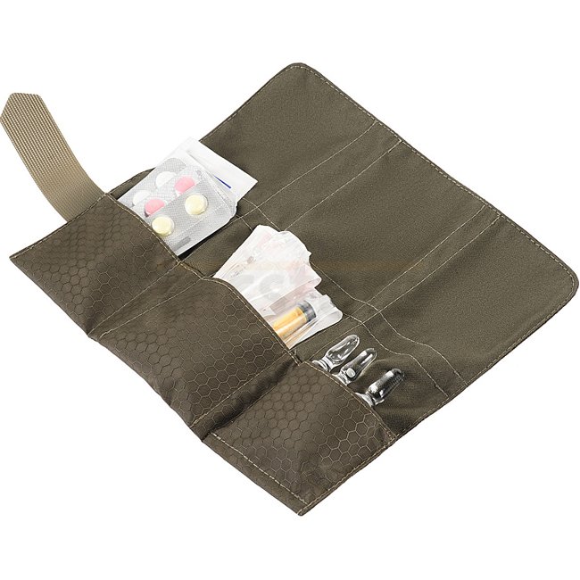 Made of Hex Polyester, a quality, durable and easy-care material. Closes with Velcro. It has three compartments for transporting an individual set of first aid prodcuts: tablets, plasters, hemostatic agents, a small number of antiseptic dressings, etc. Also, the designers have provided rubber bands for ampoules with a volume of 2ml and 5ml in one compartment. The displayed content is not incuded, the pouch is delivered empty and needs to be configured to the specific needs of the user.