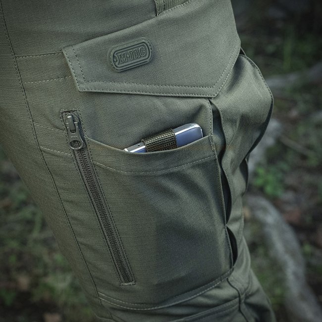 The design features of the Conquistador Flex pants is an elastic insert in the waist and near side pockets, thanks to which the trousers do not limit you when bending or leaning. They do not hinder freedom of movement and you can wear them as tactical as well as everyday clothes. The pants have a zipper and a button, they are also equipped with loops for a belt up to 5.5cm wide. Two D-rings are sewn to the front for attaching various pieces of equipment. The Conquistador Flex trousers are equipped with a large number of pockets, both utilitarian and special: there are eight pockets in total. Standard side pockets are equipped with reinforcement at the bottom - for attaching a knife clip or a flashlight to the edge of the pocket. The complex cargo pocket is equipped with an additional patch pocket, which can accommodate an M4 or AK magazine. The cargo pocket itself is quite roomy. It has two folds, due to which its size can be increased for carrying bulky items. The cargo pocket is closed by an asymmetric velcro flap with a quick-release opening. Also, the cargo pocket is equipped with a second zippered entrance, which allows you to access its contents from a sitting position.