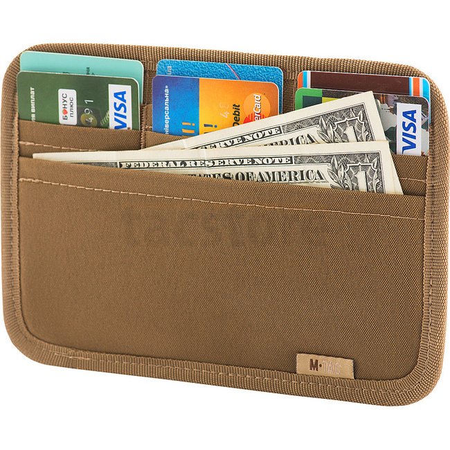 M-Tac Modular Insert Wallet - Coyote: Modular wallet with compartments for cards, business cards, and money. Compatible with any Velcro or velour-lined backpack or bag. Made of Cordura 1000D material, measuring 19 x 13 cm.