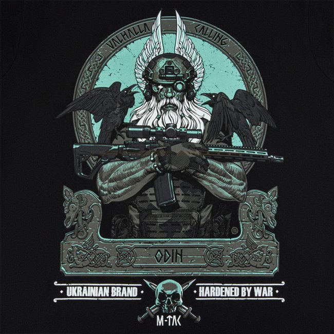 The print depicts a determined Odin who has exchanged his traditional spear (Gungnir) for an AR-15 rifle. Dressed in modern combat gear and an NVD helmet, he is ready to lead his warriors into the final battle. On Odin's shoulders sit his faithful companions - the ravens Hugin (Thought) and Munin (Memory), who fly around the 9 worlds every day and report to the supreme god about everything that has happened.