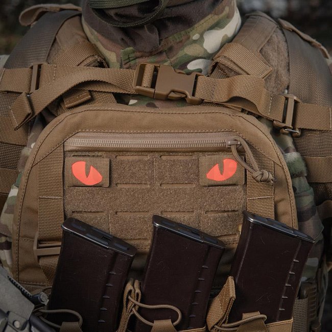 M-Tac Red Tiger Eyes Laser Cut Patch - Coyote, made with Cordura 500D fabric on the front and hook surface on the back. Measures 40 x 25 mm.