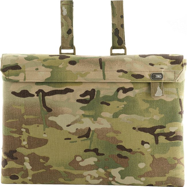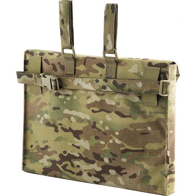 M-Tac Sleeping Mat Pouch Bundeswehr in Multicam color, designed to carry and use Bundeswehr folding mat as a seat. Features velcro straps for MOLLE attachment, waist belts, zipper closure main compartment, and buckle-fastened belt clip on sides.