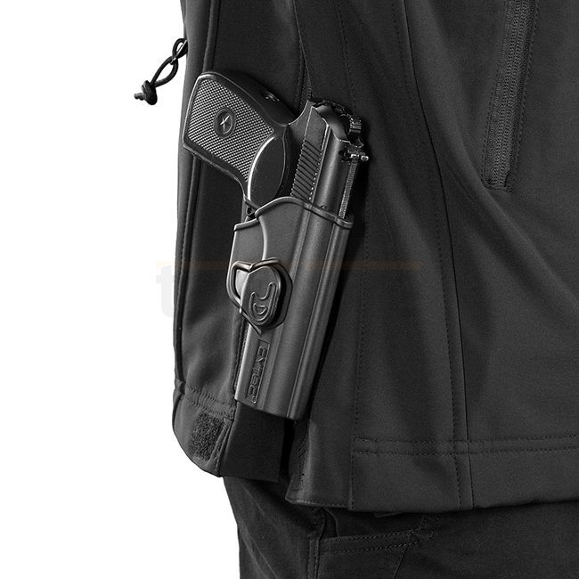 The Soft Shell Jacket is made of an interlayer polyurethane membrane that protects from bad weather. Inside, it has a thin fleece layer. It has two identification panels, which, depending on the situation, can be pulled out or remain hidden. The empty panels can be printed or emproided. A side opening system allows quick access to a side arm.