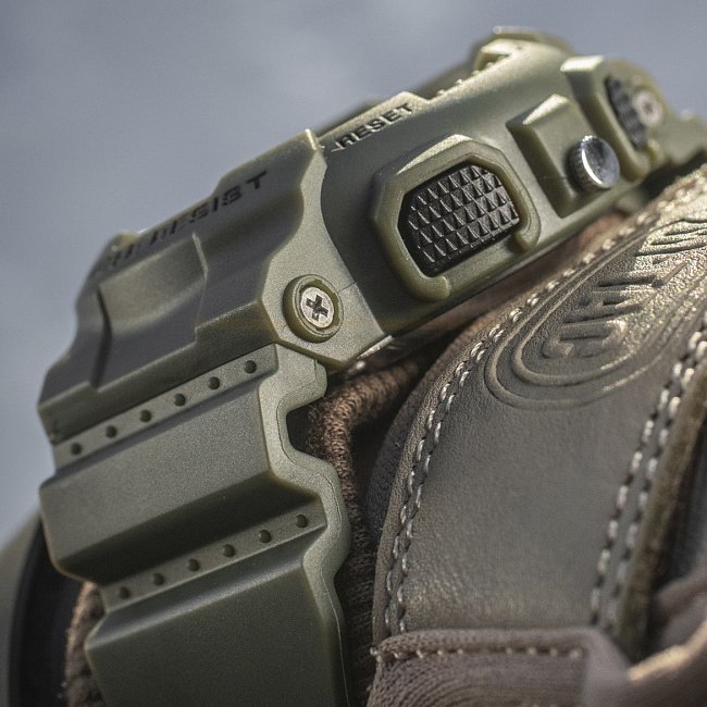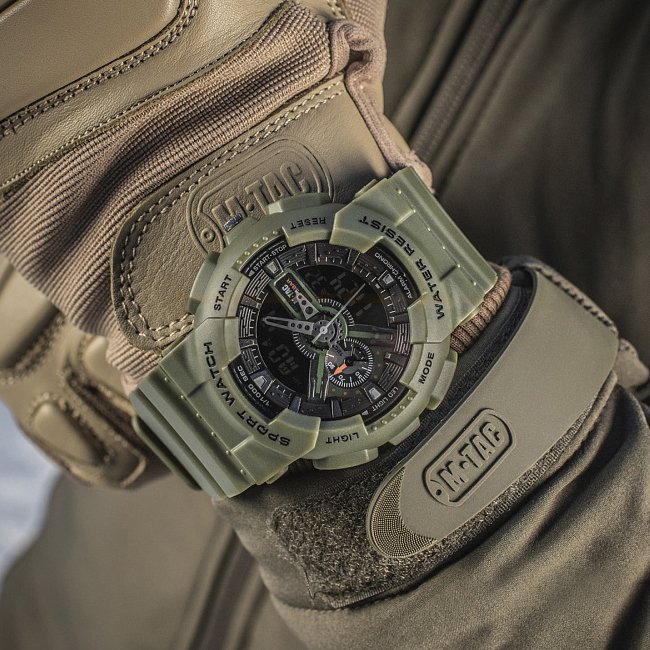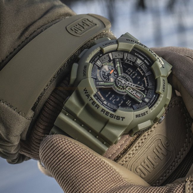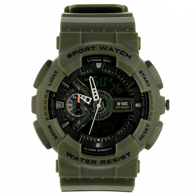 M-Tac Sport Watch - Olive: Stylish Sport Watch with durable polycarbonate case and glass, waterproof, and multifunctional with 12/24 time format, stopwatch, alarm clock, automatic calendar, and LED backlight. Perfect for outdoor activities and sporty styl
