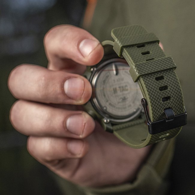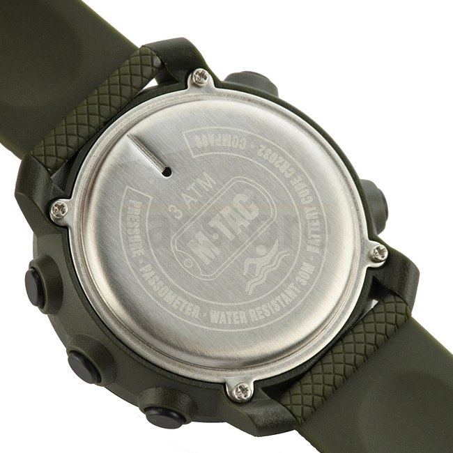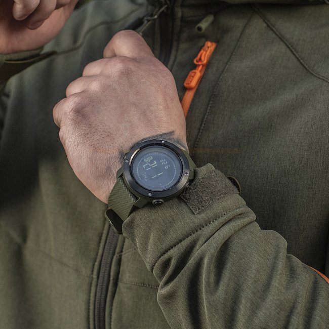 M-Tac Watch Multifunctional Tactical - Olive. The ultimate watch for extreme sports and everyday use. Monitors atmospheric pressure, air temperature, and health. Rugged polycarbonate case, stainless steel bezel, scratch-resistant glass. Water-resistance 3