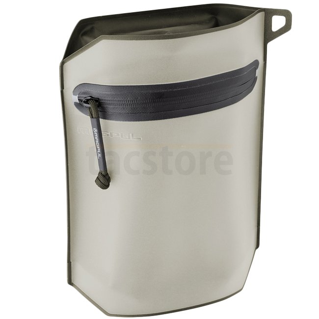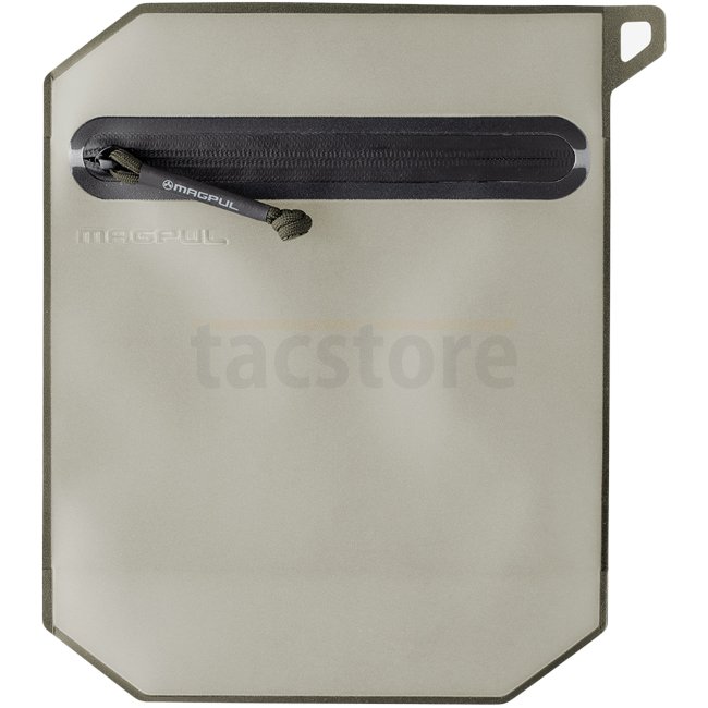 A splash and dust-proof, large-sized pouch manufactured by Magpul for storing and securing small items from weather conditions. The construction of the bag allows it to stand vertically on its own.