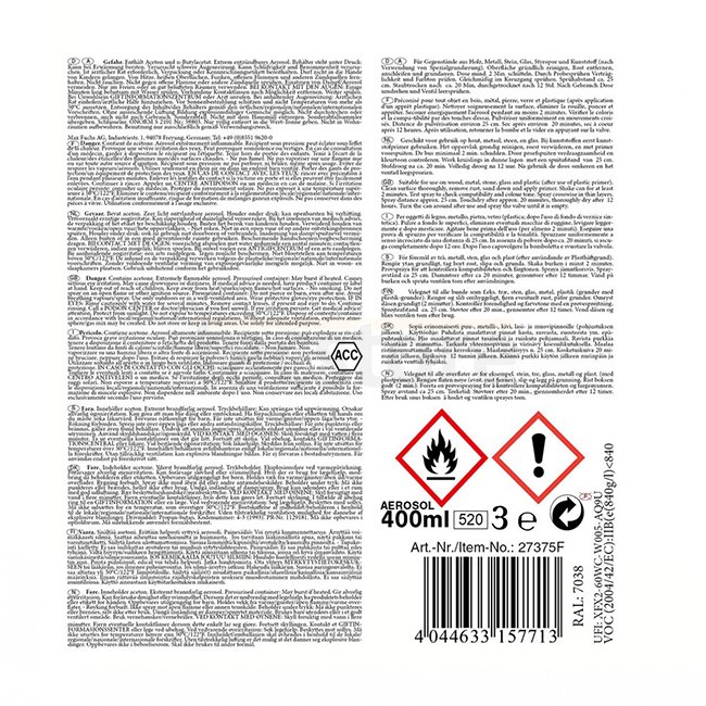Nitro combination resin varnish for various surfaces like metal, wood, stone, glass, styrofoam, and plastic. Dries quickly in approximately 20 minutes and fully cures in around 12 hours. Color: RAL7038. Purchase limit: 60 pieces per order. Contains Aceton