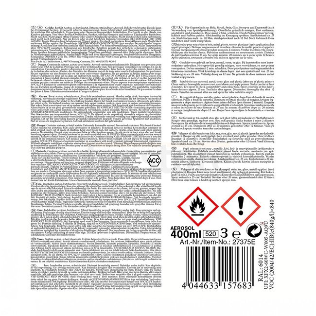 MFH Army Spray Paint 400 ml - Olive Green - Nitro combination resin varnish for metal, wood, stone, glass, styrofoam, and plastic. Dries dust-dry in about 20 min, completely dry in about 12 hours. RAL6014. Max order quantity = 60 pieces. Contains Acetone