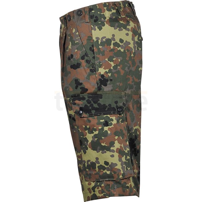 MFH BW Bermuda Shorts in Flecktarn pattern, size XL. Features 2 leg pockets with flap and press button, 2 pants pockets, front zip, 1 hip pocket with button fastening, belt loops ca. 5 cm, and suspender buttons. Material: 65% Cotton, 35% Polyester.