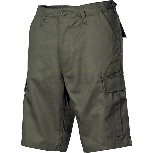 MFH BW Bermuda Shorts Side Pockets in Olive, 2XL. Front zip, 6 pockets, adjustable waistband, wide belt loops. 65% Polyester, 35% Cotton.