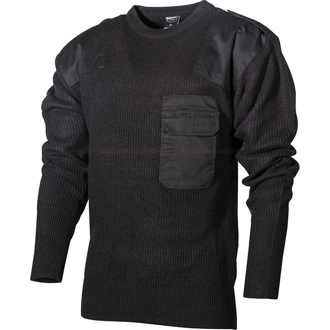MFH BW Pullover Chest Pocket Polyacryl - Black - 48: Pullover with chest pocket, pen pockets, epaulettes, elbow facing, knitted collar, German flags. Material: 100% Acrylic, Trimming: 65% Polyester, 35% Cotton.