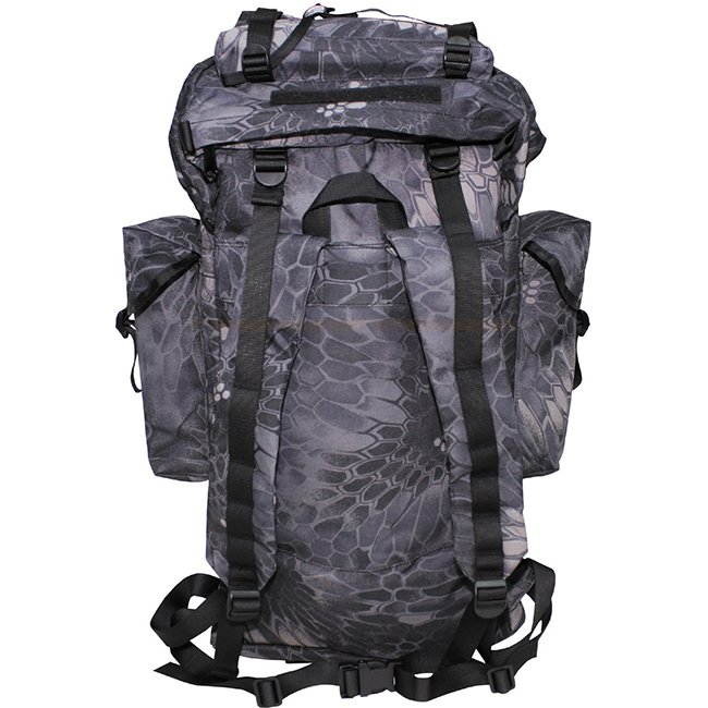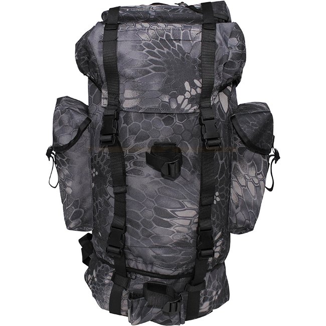 Adjustable, padded shoulder straps adjustable waist strap with click closure 1 top carrying handle velcro panel ca. 15 x 2,5 cm on the top backside lid with 1 attached pocket with flap and strap closure as well as 1 front slide-in pocket with velcro and 1 large zip pocket at the back main compartment with seperable bottom compartment (drawstring) outside zip for access to bottom compartment double drawstring on top of the main compartment flat inside slide-in compartment for e.g. sleeping pad aluminium stability rod on the inside upper area 2 side pockets with flap and strap closure small pocket with velcro on the lower frontside various fastening straps 4 front click closures Capacity: ca. 65 l Dimensions: ca. 43 x 63 x 21 cm (W x H x D) Weight: ca. 1,3 kg