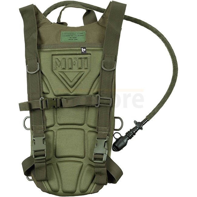 MFH Hydration Backpack & TPU Bladder Extreme 2.5 l - Olive - Adjustable shoulder straps with 2 D-rings and click closure, adjustable chest strap, structured padding for ventilation and slide-in compartment. Lightweight and durable polyester material.