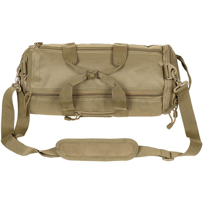 Detachable, adjustable shoulder strap with adjustable, detachable padding 2 carrying handles with press button lid with 2-fold zip and velcro compartments outside: 1 small compartment with ID window on the long side 1 attached side compartment with slide-in pocket, zip and carrying handle Molle attachment loops on 2 sides compartments inside: large, round main compartment 2 divided side compartments with velcro, 1 of them made of breathable mesh fabric Capacity: ca. 12 l Dimensions: Total length: ca. 45 cm Length inner compartment: ca. 40 cm Diameter: ca. 19 cm Weight: ca. 600 g
