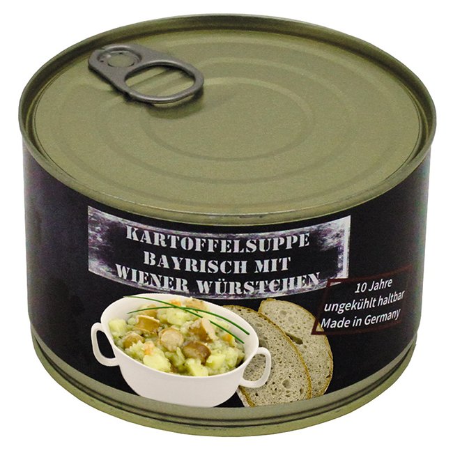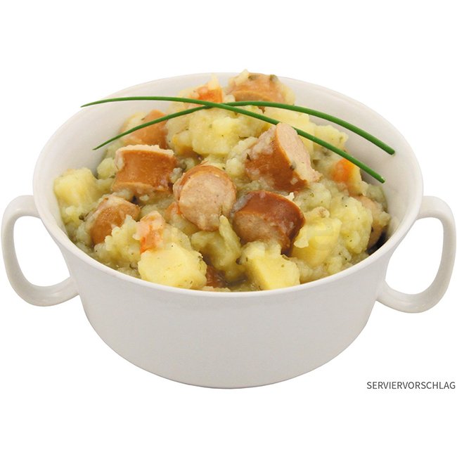 Handmade from local ingredients in Germany no mechanically seperated meat processed store dry at room temperature lactose- and gluten free Ingredients : 85% potato soup: potato, drinking water, stone salt, vegetable stock, bacon, onion, pepper, sugar, marjoram, parsley, vegetables, 15% Wiener sausages: pork, drinking water, spices (contains mustard), spices extracts, glucose, stabilizer: diphosphates, antioxidants: ascorbic acid, sodium nitrite, sheep bowel, beechwood smoke, may contain celery Nutritional values per 100 g: energy in kJ/kcal: 1378/332 fat 26,35 g, of which saturates 10,52 g carbohydrates 8,02 g, of which sugars 1,58 g protein 15,21 g, salt 3 g Content: 400 g