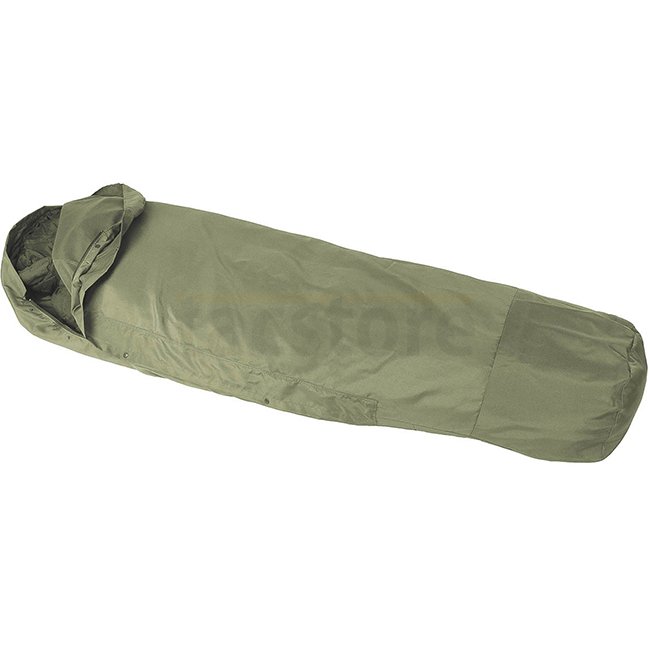 MFH Sleeping Bag Cover 3 Layer Laminate - Olive - Modular sleeping bag system suitable for item nos.: 31175 and 31185, with lateral opening, press buttons, and transport bag. Pack size: 10 x 35 x 10 cm, dimensions: 220 x 75 / 48 cm. Weight incl. bag: 1.00