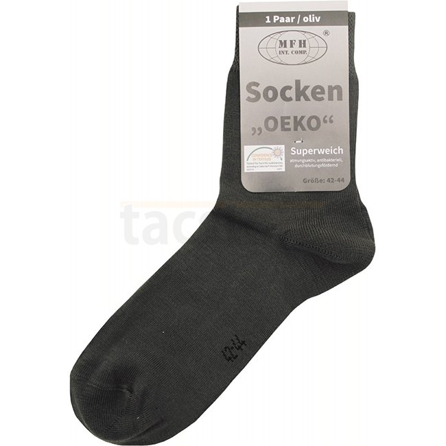MFH Socks Oeko in Olive color, size 45-47. Made of bamboo viscose, hand-linked seams, soft and breathable, stimulate blood circulation, OEKO-TEX STANDARD 100 certified. 75% Viscose, 22% Polyamide, 3% Elastane.