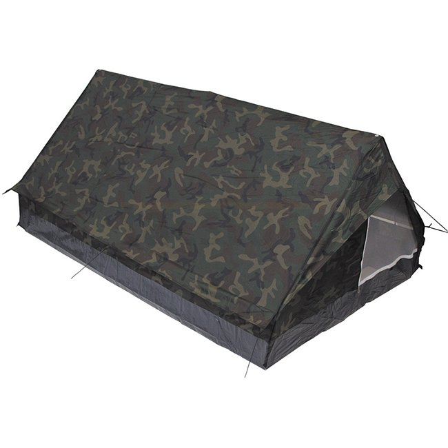 MFH Tent Minipack - Woodland: Single-walled tent with divisible metal poles, mosquito net entrance, sturdy PU fabric groundsheet, steel tent pegs, guy ropes, and transport bag. Water column: 1500 mm. Pack size: ca. 55 x 12 x 12 cm. Weight: ca. 1.6 kg. Mat