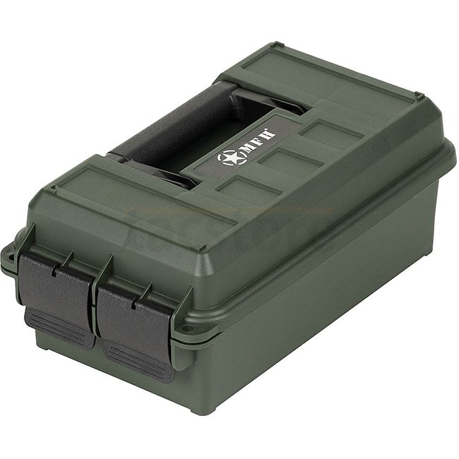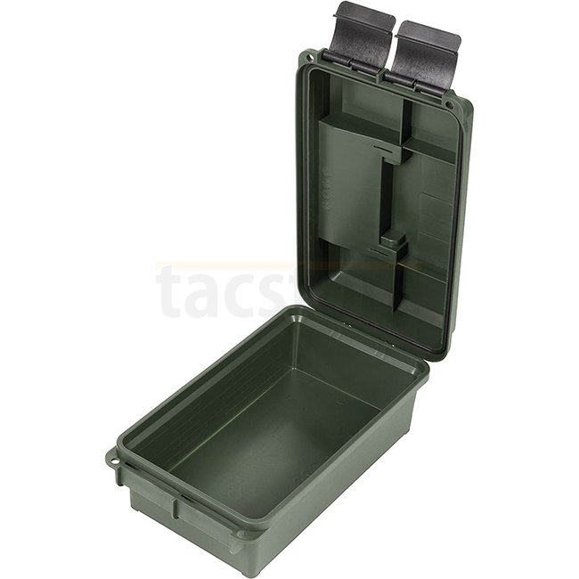 MFH US Ammo Box Plastic - Olive. Shockproof, waterproof, lid with rubber seal, lockable handle, 2 snap locks, stackable. Dimensions: 34 x 19.5 x 13.5 cm. Weight: 660g.
