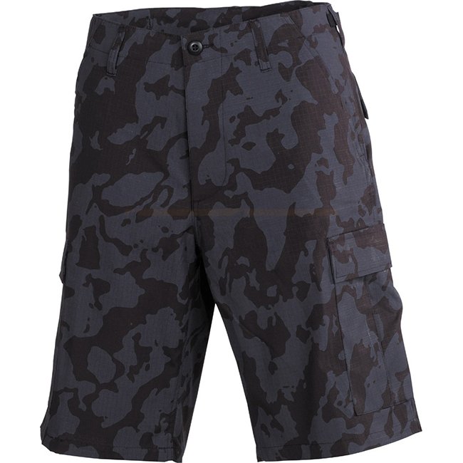 Comfortable MFH US Bermuda Shorts Ripstop in Night Camo with button fly, 6 pockets, adjustable waistband, and 100% Cotton material.