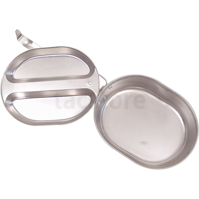 MFH US Mess Kit: Stainless steel mess kit with a pan and a divided plate. Lightweight and compact for outdoor adventures. Comes with foldable handle and transport fixation.