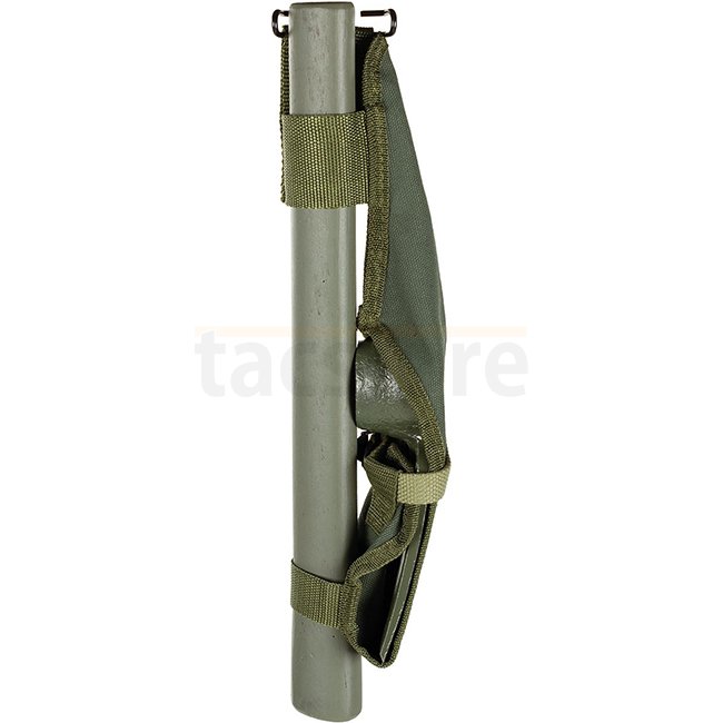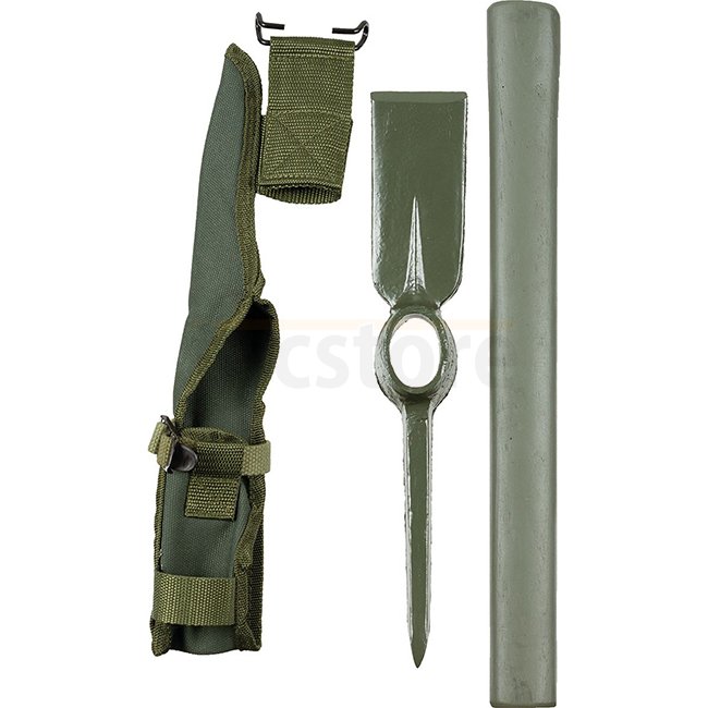 Pickaxe with spike and flat ending, quickly demountable, canvas transport cover, belt attachment