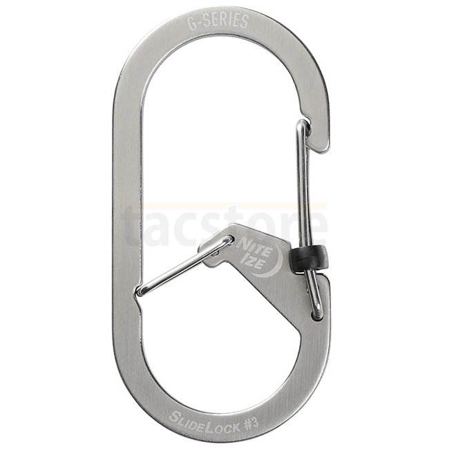 Nite Ize G-Series SlideLock #3 in Silver, compact and durable stainless steel locking mechanism. Dimensions: 32 x 64 x 6.5mm, Weight: 18g. Warning: Not for climbing.