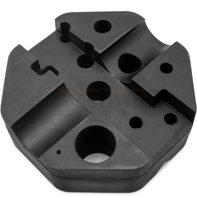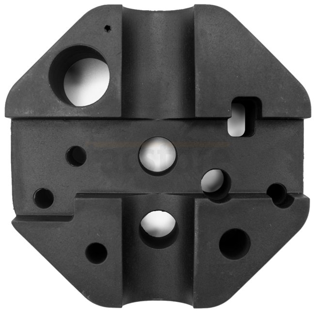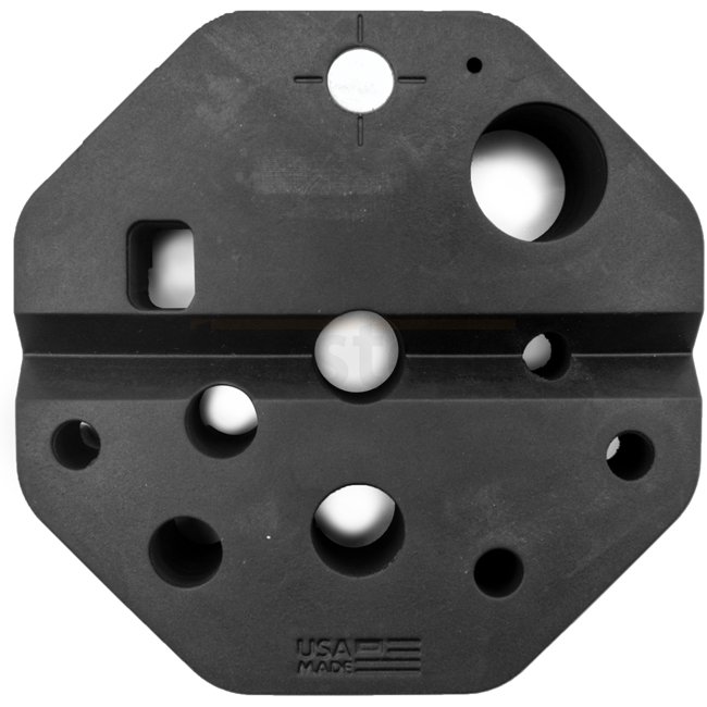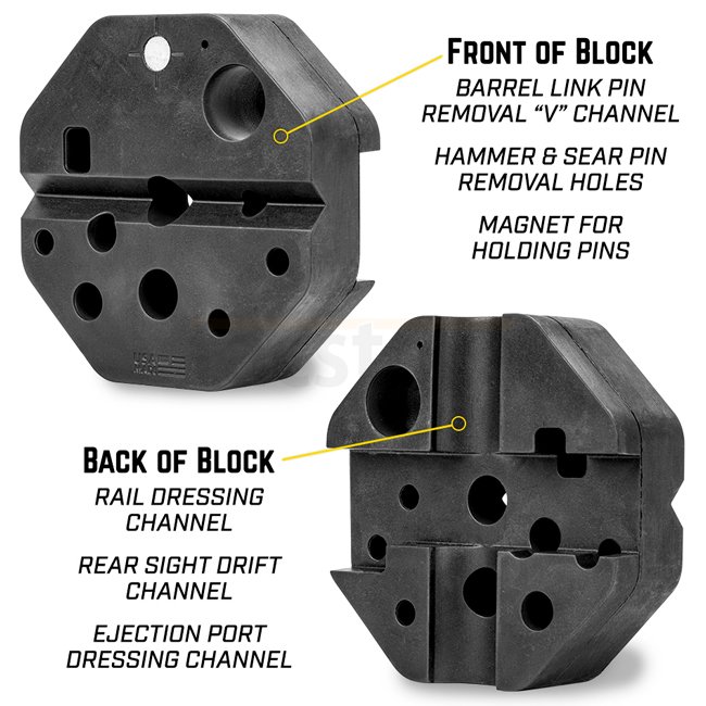 This general use bench block accommodates a wide variety of firearm take down needs. A variety of oversized holes are featured on the block to allow for pin removals sized 1/16” – ¾”. Flat and round pockets securely accommodate nearly any pistol slide while the v-cut offers a stable surface for working with larger round objects such as a rifle bolt or top of a rounded pistol slide. The square hole is designed to assist while easily removing the rear sight from nearly any pistol. The block also features a magnet to store small parts such as springs and pins. Made in the USA.