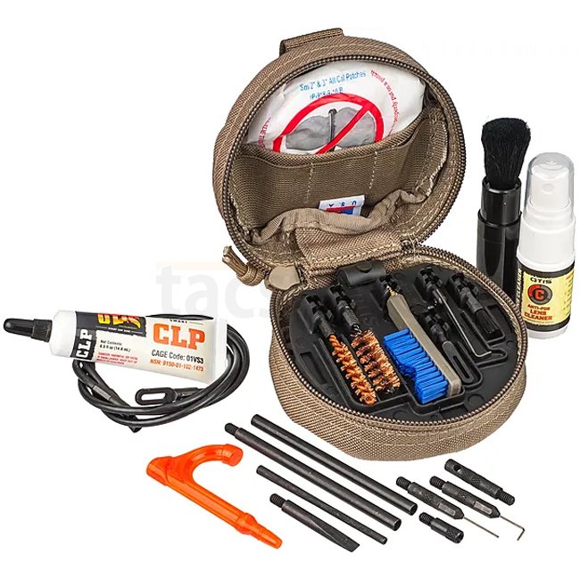 Cleaning kit for 5.56mm rifles and 9mm pistols, stored in a soft 10x10x6cm case. Includes patches, bore brushes, memory-flex cable, cleaning tools, and more. Made in the USA.