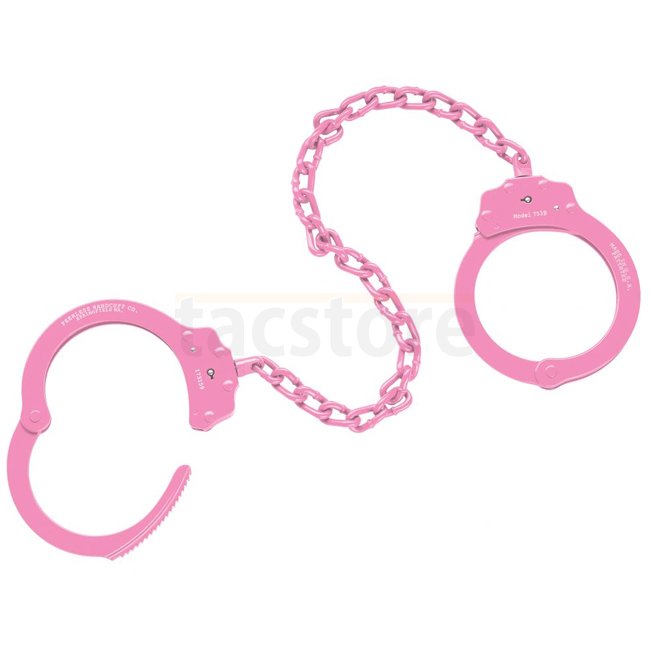 Peerless Model 753C 15 Leg Iron in Pink color features all steel construction for durability. Complies with NIJ standards, has 38cm chain for limited motion, improved lock mechanism, and lifetime warranty. Electrolytic Polyurethane Plating ensures rust re