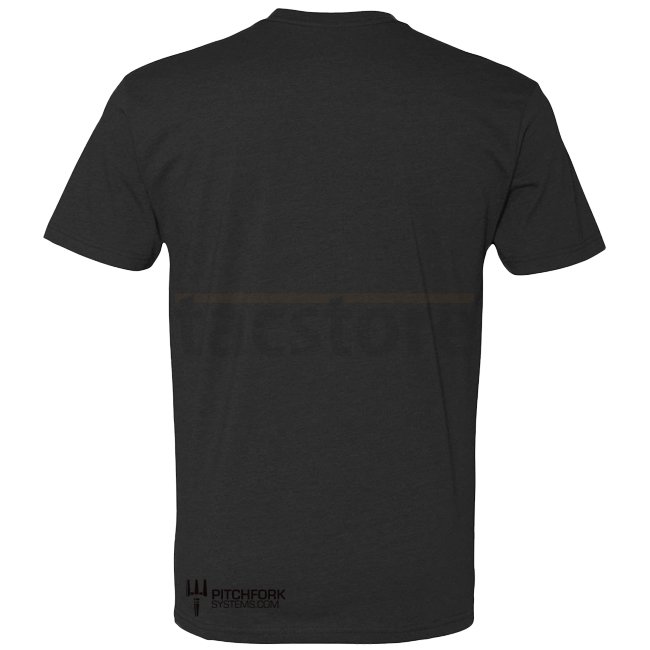 A stylish casual pitchfork print t-shirt in black, featuring a big trident at chest height and a smaller PFS logo at the back hem. Semi-tight cut for a perfect fit from a 50/30 cotton-polyester blend. Comfortable and functional, with product info printed