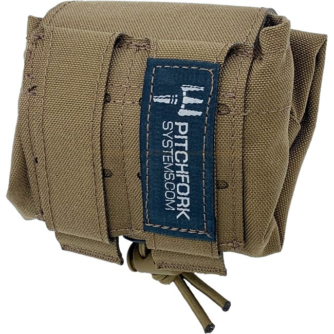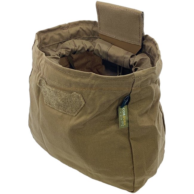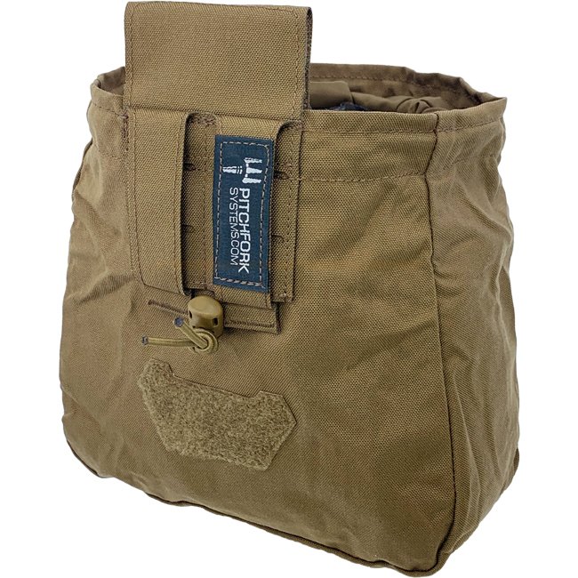 Convenient Pitchfork Dump Pouch Short in Coyote color, designed for 6x AR15 or 4x SIG 55x magazines. Fits belts/MOLLE systems. Folds for easy storage, opens quickly with rubber flap. Adjustable size, durable Cordura 500D Nylon construction.