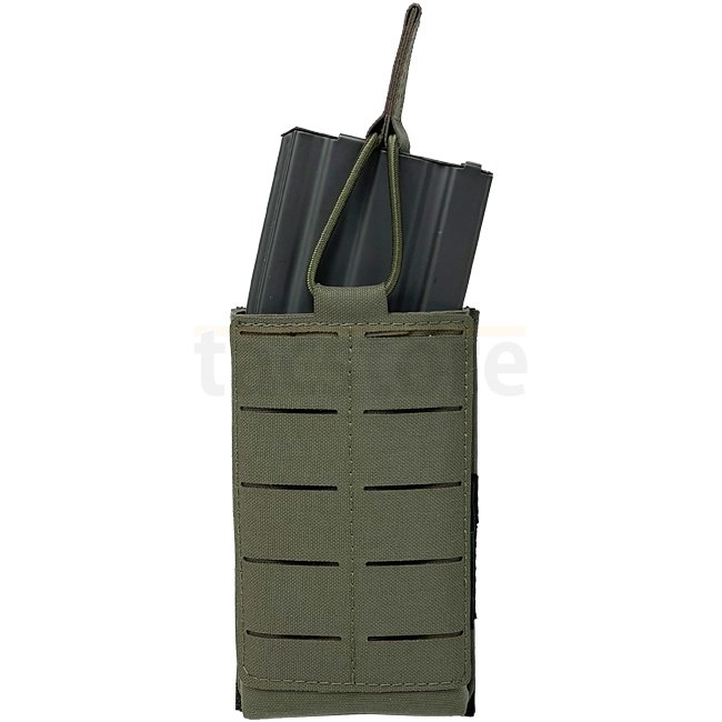 The Pitchfork Open Single AR15 Magazine Pouch in Ranger Green is designed for M4/M16 magazines. Adjustable pull tab and anti-slip interior for enhanced grip. Features MOLLE system-based LaserCut surface for attaching additional pouches. Double layer Cordu