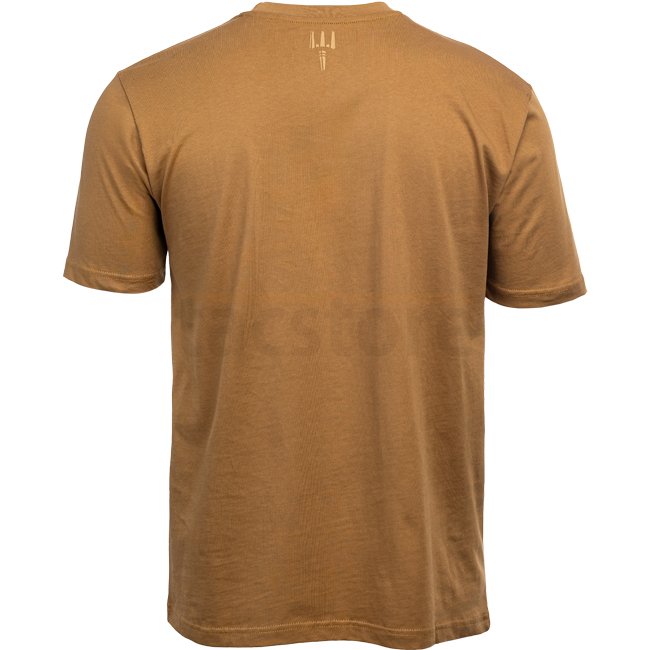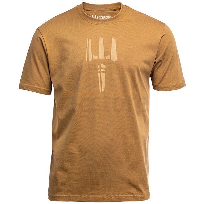 Pitchfork Trident Print T-Shirt - Coyote - L: Large trident at chest height, small trident at back neck. Semi-tight cut for comfort. Medium-weight 50/30 cotton-polyester blend. Functional & simple design.