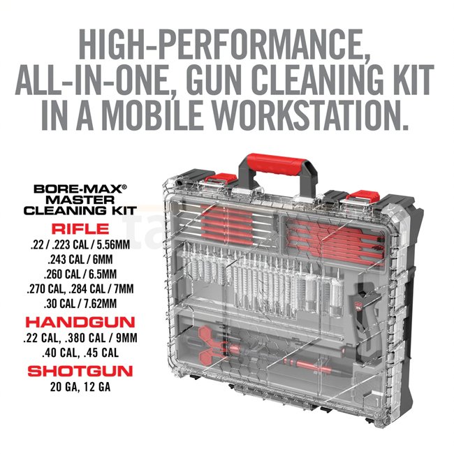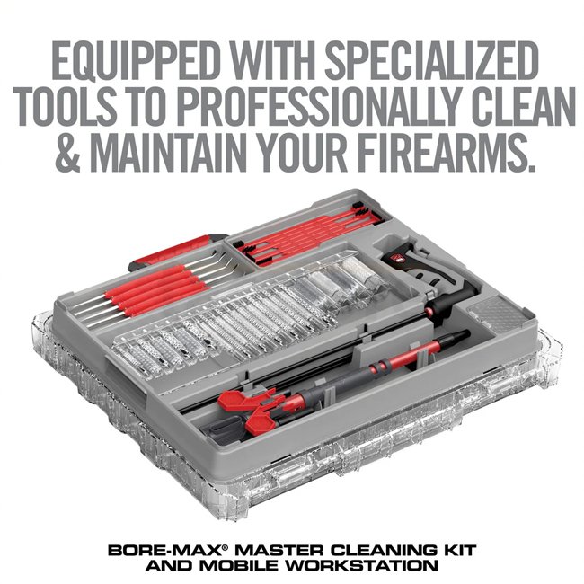 This kit combines the precision of a Bore-Max Speed Clean System™ with the convenience of a Mobile Workstation. It serves pistols (.22–.45 CAL), rifles (.223 CAL/5.56 mm–.30 CAL/7.62 mm) and 12 & 20 GA shotguns, delivering unmatched cleaning efficiency, portability and organization.