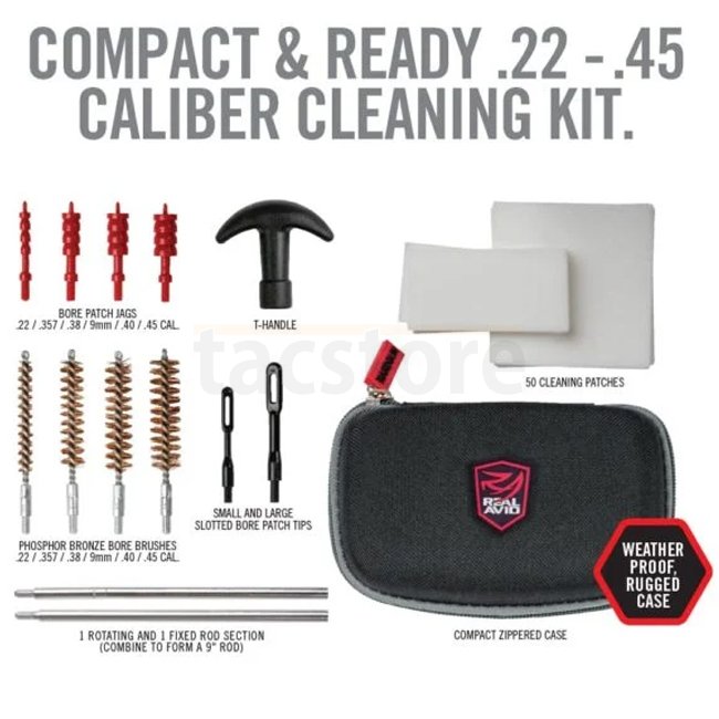 Big functionality in a small rugged package that easily fits into a pack or range bag. A complete cleaning kit designed to keep your handgun tip-top. No annoying loose parts. Smartly organized, each bore brush, jag, patch tip, rod and handle is held securely in place. This sets the standard for a portable handgun cleaning kit. |