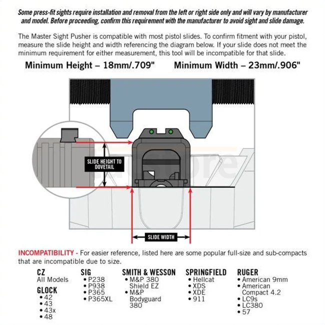 The Master Sight Pusher is a professional grade tool that makes quick work of changing pistol sights while protecting both gun slides and the sights themselves.