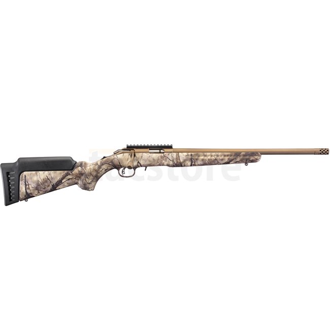 The Ruger American Rimfire in .22 WMR features an 18" cold hammer-forged barrel with 1/2"-28 threaded muzzle and installed brake, coated in a rugged Burnt Bronze Cerakote® finish for enhanced durability.