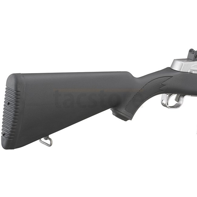 The Ruger Mini-14 Ranch Rifle Stainless 5.56 NATO Model 5817 features a rugged Garand-style action with a breech bolt locking system, fixed-piston gas system, and self-cleaning moving gas cylinder for maximum reliability under harsh conditions. The black synthetic stock ensures durability and weather resistance.