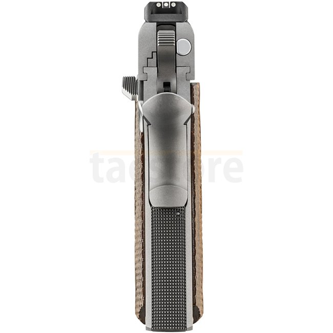 The beavertail grip safety ensures a secure, high hold, promoting control and minimizing the risk of slide bite during operation.