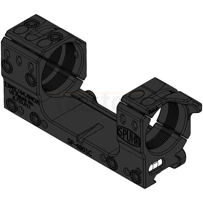 The Spuhr SP-4801C is a high-quality scope mount designed for rifles equipped with MIL-STD-1913 or STANAG 4694 Picatinny rails. It is especially suitable for bolt-action rifles with one-piece Picatinny rails. This mount provides a 13 MIL (44.4 MOA) tilt, facilitating precise long-range shooting adjustments. With a height of 30 mm and an overall length of 130 mm, it offers versatility for various shooting configurations.