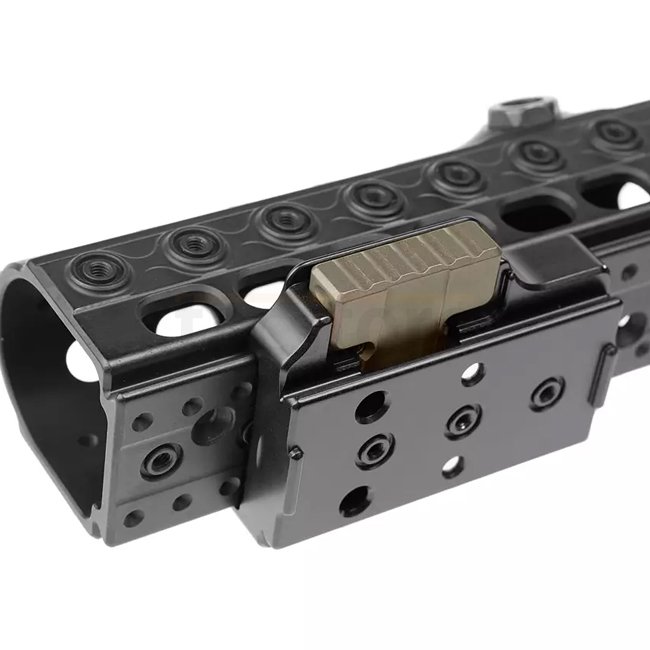 The CA001 features an ARCA-Swiss base compatible with any standard ARCA-Swiss clamp. It is specifically designed for seamless integration with the SICS™ ARCA-Swiss pattern forend, allowing users to swiftly adjust the position of their bipod or tripod along the chassis forend with a simple button press. Please note that the CA001 is tailored for the SICS™ locking mechanism and may not securely attach to other brands' ARCA-Swiss forends or plates unless they have been adapted accordingly.