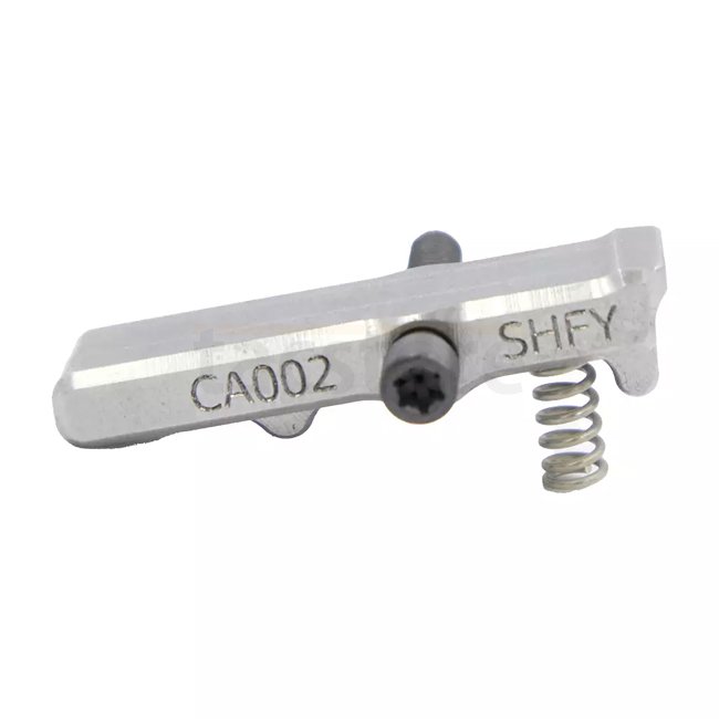 The Spuhr CA002 SICS™ Mag Catch is an extended, unfitted magazine catch designed for custom gunsmithing applications. It allows for precise fitting when a magazine requires a non-standard seating depth, ensuring optimal performance and reliability.
