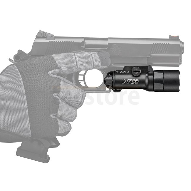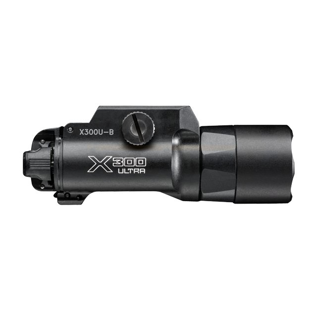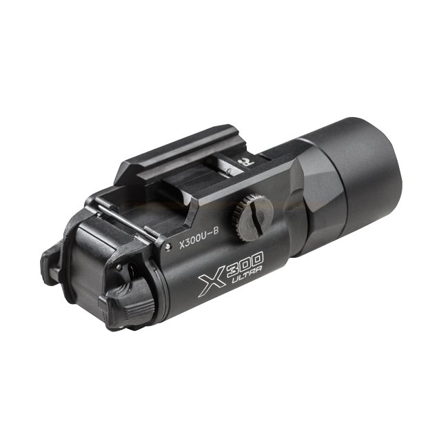 The SureFire X300U-B LED Light in black color is a powerful and compact flashlight with 1000 lumens output, 1.25 hours runtime, and a range of 213 meters. It features permanent and momentary activation modes, IPX-7 casing, and Picatinny system compatibili